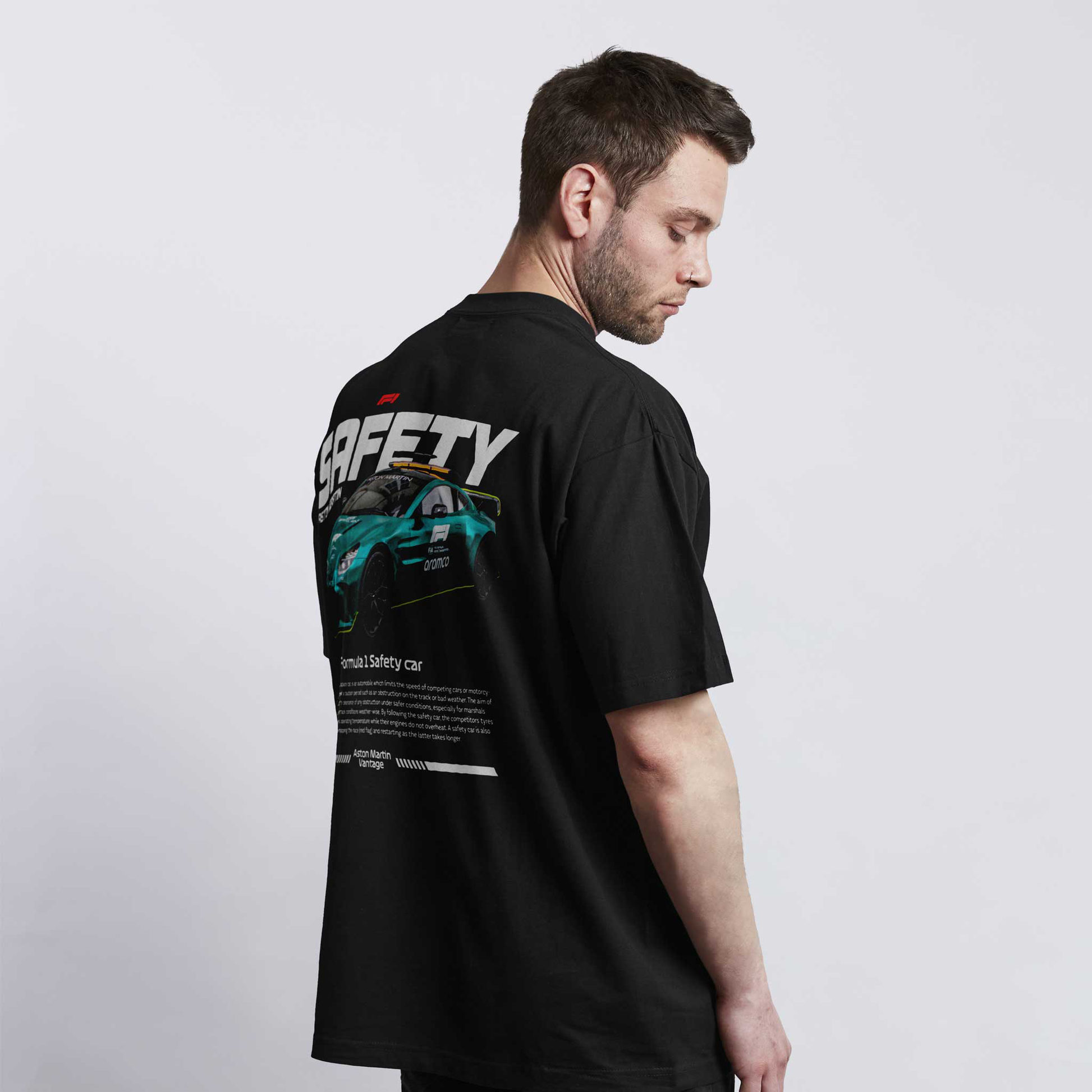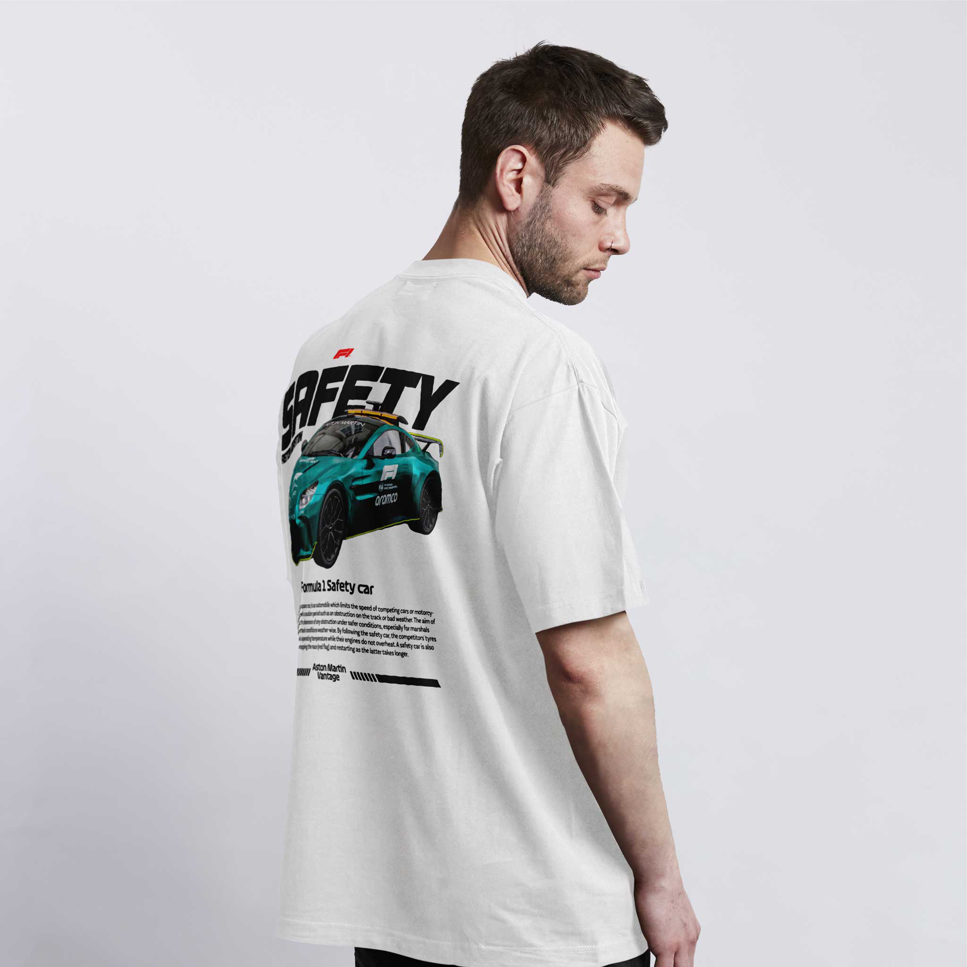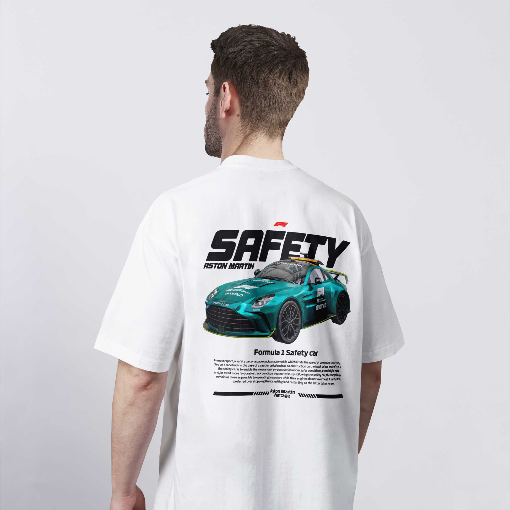 Aston Martin Safety Car oversized majica donosi prepoznatljiv F1 izgled i energiju trka. Impozantan print Safety Car bolida i udobnost 100% nebrušenog pamuka čine je idealnom za ljubitelje brzine, motorsporta i modernog streetwear stila.